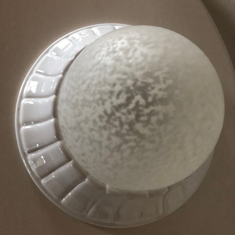 Pen taklampe/pendel, passer fint over spisebord e.l. Fungerer som den skal og gir godt med lys. Diameter på metallplata er 22 cm, glasskuppelen er ca 15 cm på det største.