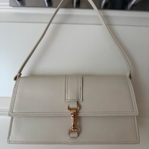Clutch/skulderveske i beige skinn med justerbar skulderrem og flere rom for oppbevaring. Vesken har en klaff med spenne. Brukt kun en gang. Kan hentes på Skjetten.