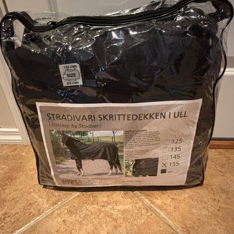 Stradivari dekken i svart farge. Laget av slitesterkt materiale med flere festemuligheter. Passer til bruk som beskyttelse for hest ved ulike anledninger. 100 grams med ull. Rift på ene siden bak. Se bilde.