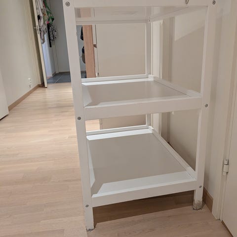 Jollyroom stellebord i grå farge med svart ramme. Har sikkerhetsbelte og oppbevaringshylle under. Passer for barnestell. Liten revne i bunndelen, men uten betydning for sikkerheten til barnet som ligger over. Har ikkje blitt renset, men er heller ikkje utsatt for "uhell".