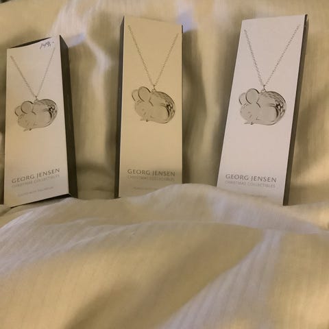 Koselig motiv i sølv. Henges opp i sølvfarget bånd. Design av Ann-Sofi Romme.