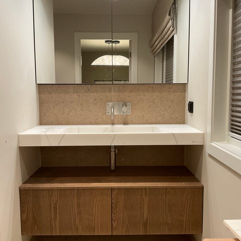 Villeroy & Boch servantskap, porselensvask, blandebatteri og More To See Speil