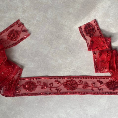 Hvit belte med dekorative gullfargede mynter festet langs kanten. Belte er laget av stoff og har en bredde på omtrent 12 cm og en lengde på ca. 70 cm. Kan brukes som tilbehør til klær eller kostymer. Mangler noen mynter.