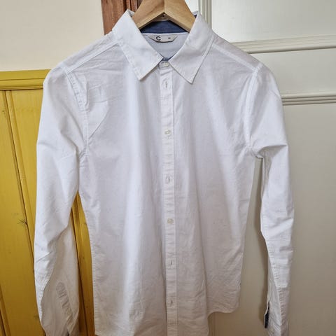 Selger en pen hvit skjorte fra Cubus med stilige blå detaljer på innsiden av kragen og ermene. Klassisk design med krage og knapper, perfekt som dresskjorte til konfirmasjon, fest eller skole. Størrelse 170, passer til ungdom. Skjorten er fint brukt og i god stand.