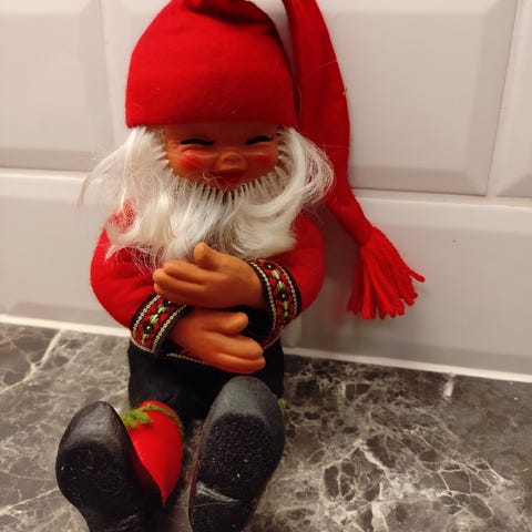 Ca 30cm høy. Ingen skader. Litt slitasje på klær.