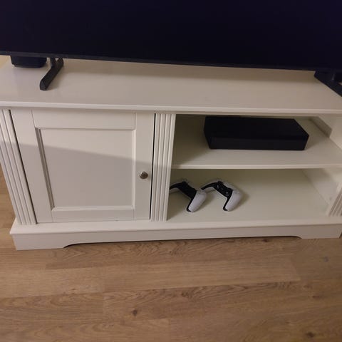 Hvit TV-benk – romslig, pen, liten feil på skuff