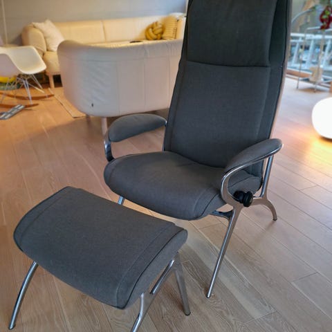 IKEA Poäng lenestol i bjørkefiner og mørk brunt skinn. Veldig god å sitte i, har slitasje merker på armlener. Stolen må hentes i Vestby og kan gjøres flatere for å frakte i bil.