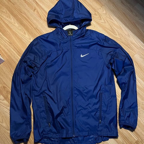 Nike Løping jakke i størrelse L, designet for unisex bruk. Jakken har hette og er laget for løping. Fargen er svart.