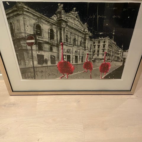 Mål: 25cm x 28cm. Bildet inkluderer detaljer som gardiner, et bord og et portrett på veggen. Fargene er dempede med fokus på naturlig lys fra vinduet.