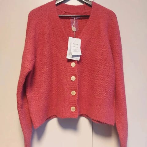 Hel og fin genser selges i nydelig grønnfarge.