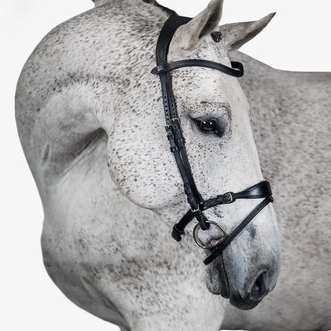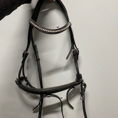Selger er nydelig dressurhodelag str full. Lakk anatomisk nesereim med svarte stener. Følger med tøyler.