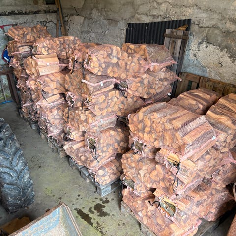 Godt istappa sekkar 60l med eik og bjørk. Siste rest av årets ved. Skikkelig tørr, tørka i ni månader