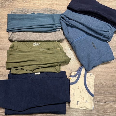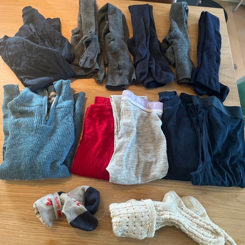 Flott klespakke med ullsett i størrelse 122 / 128 i blå og grå farge. Ullundertøy.