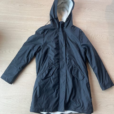 Lett vannavvisende mørkeblå parka, str L fra Days Like This. Veldig god og romslig hette, glidelås og knepping, stramming i midjen og to lommer i siden. Veldig mørk blå så ser nesten svart ut. Pent brukt.