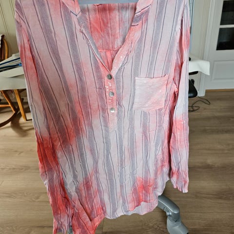 Nydelig prikkete bluse i sort og gull, med stor rysjekrage og glitrende knapper. Kjøpt på Arven Vintage i Trondheim, men jeg får dessverre aldri brukt den. Står ingen størrelse på den, men vil si den tilsvarer en L. Fantastisk bluse som er skikkelig Melodi Grand Prix ☺️