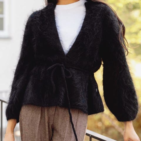 ella&il Cardigan i blå farge, størrelse XL for dame. Cardiganen har en myk tekstur og er utstyrt med belte i midjen for justerbar passform.