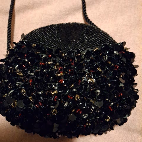 Det har gått litt opp i limet på den ene siden (se bilde), men dette er enkelt å fikse. Ellers hel og pen. Fin som statement-veske til fest og sommerbruk.