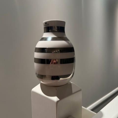 Kähler Vase i hvit perlemor. Vasen har en høyde på 31cm og kjennetegnes av sitt stripete mønster. Egnet som dekorativ gjenstand i hjemmet. Nypris på nett er 549