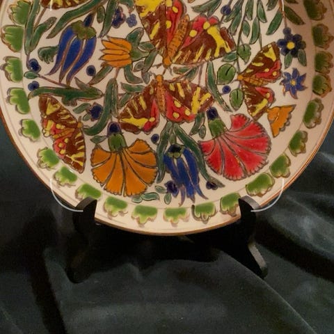 Tallerkenen er glasert på forsiden, usglasert terrakotta på baksiden med innrisset signatur og påmontert metalloppheng, klar til å henges rett på veggen.