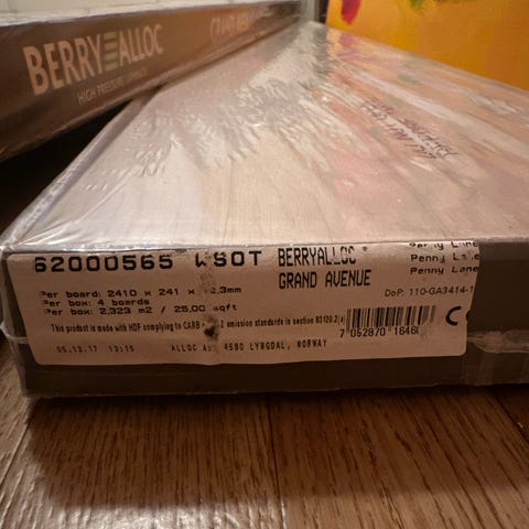 Bakersfield gulvplanker med dimensjoner 2250x236x12 mm og 1,5 mm underlag. Pakken inneholder 5 planker per eske, totalt 2,655 kvadratmeter. Har en pakke til med 4 gulvbord også som kan kjøpes til halv pris (100kr/kvm).