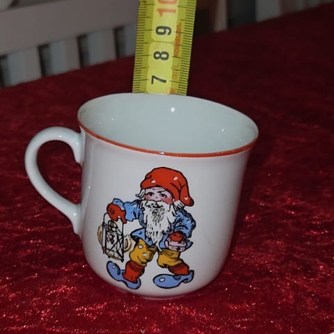 Kruset er ca. 7–8 cm høyt og rundt 7 cm i diameter, passer fint til espresso, gløgg eller barnas julecocoa; i pen brukt stand uten nagg,.