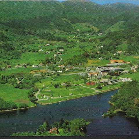 Postkort med flyfoto av Førde i Sunnfjord. Meget pent, ubrukt A6-format. Se bilder