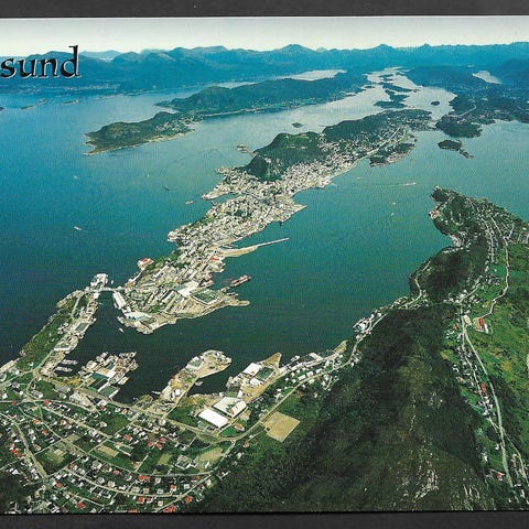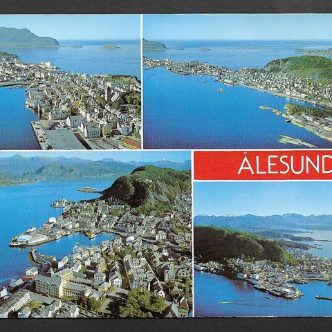 Postkort med bilder fra Kristiansund. Motiver inkluderer byens bygninger, flagg og havneområde. Postgått, stemplet Kristiansund. Pent, A6-format. Se bilder