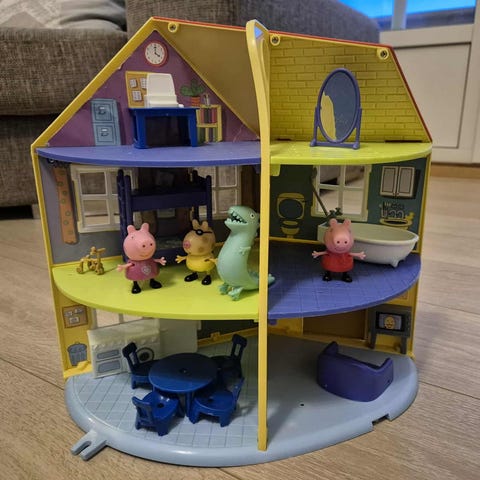 Peppa Gris Peppa's Family Home lekesett med flere etasjer og møbler. Settet inkluderer ulike rom og tilbehør for rollespill, egnet for barn som liker Peppa Gris-serien.