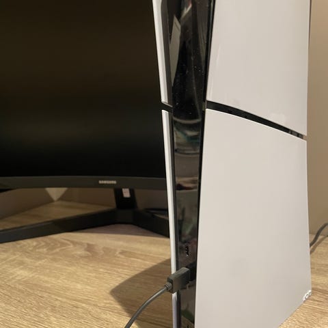 Sony PlayStation 5 spillkonsoll med hvit og svart farge. Konsollen har et moderne design og leveres med en trådløs kontroller. Egnet for videospill og underholdning.