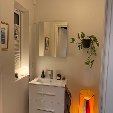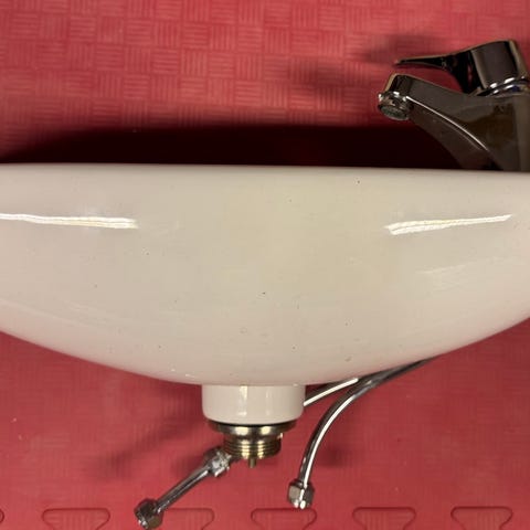 Liten servant med Oras blandebatteri. Servanten er 47.5 cm bred og 36 cm dyb. Brukt, men alt fungerer som det skal og er oppbevart frostfritt. Passer til baderom og toalettrom.
