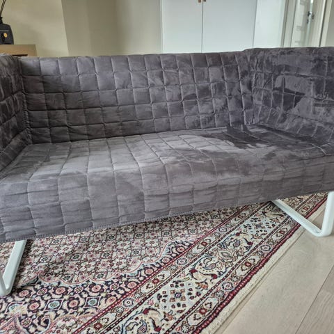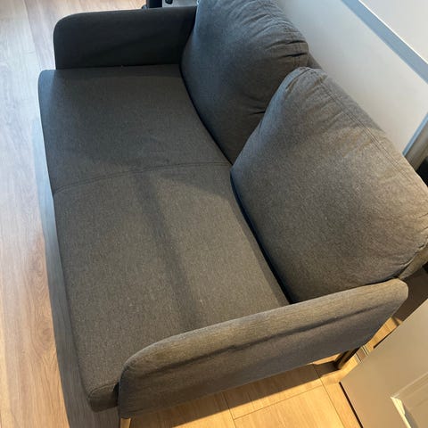 Knapparp sofa brukt på barnerom. Vaskbart trekkk. Har merke etter klistremerke som ikkje gjekk av i vask, sjå merking og bilde.