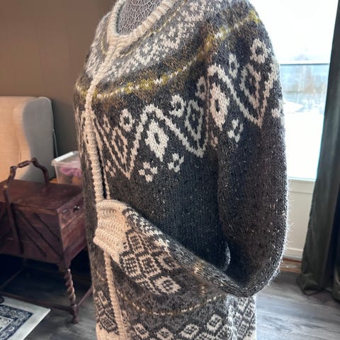 Jakken er strikket av meg, ble dessverre for stor og er kun prøvd på.