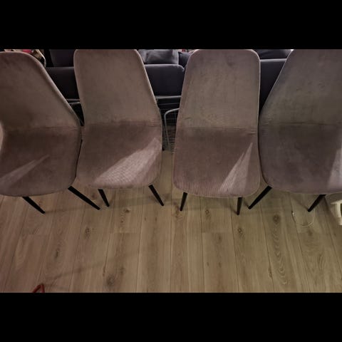 Pent brukte stoler, plastknottene oppunder noen stolben på skiftes