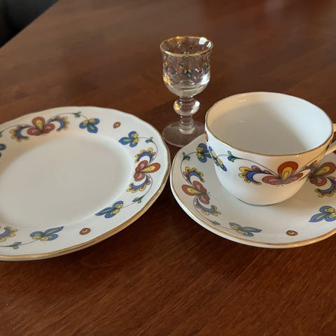 Bondemønster fra Porsgrunn Porselen servise som inkluderer fløtemugge og sukkerskål. Serviset er laget i porselen og har dekorative mønstre i flere farger på hvit bakgrunn.Fløte og sukker 300,- til sammen.