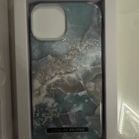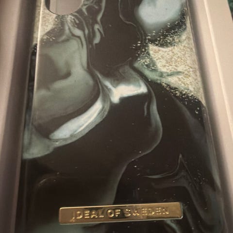 IDEAL OF SWEDEN telefondeksel med marmor mønster. Dekselet har åpninger til kamera og knapper, og beskytter telefonen mot riper og støt. Designet har en kombinasjon av hvite og beige toner med gullfargede årer, som gir et elegant utseende.