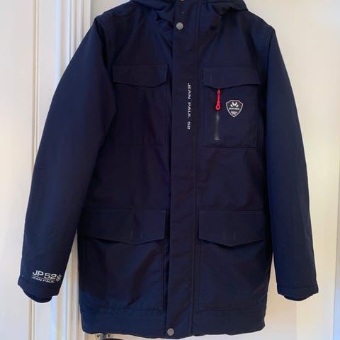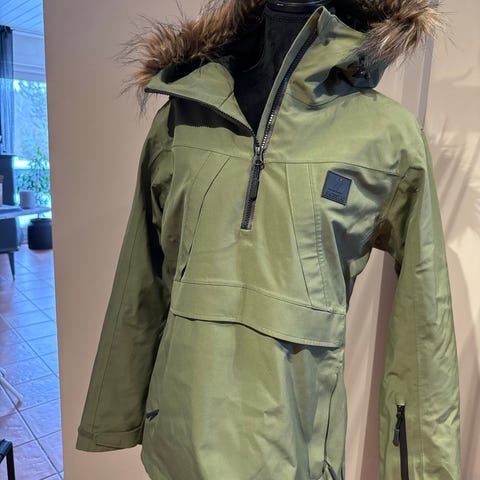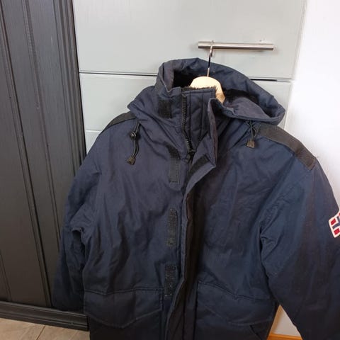 Kraftig anorakk, fargen er mørkeblå. Jakka er foret innvendig. Den har fire lommer, alle med glidelås som er beskyttet/skjult av stoff. De to skråstilte lommene er veldig store. Størrelsen er S herre, men er brukt av dame som pleier å være i 42, så altså mer unisex. Glidelåsen kan åpnes nedenfra. Jakka kan strammes i livet. Jakka kan festes under skrittet. Hetta er fastsydd, kan strammes.