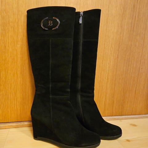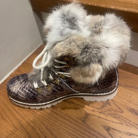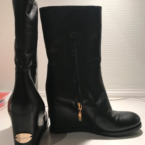 Italiensk vintermokkasiner i størrelse 38 med svart farge. Støvlene har pelsfôr og dekorative metallringer på oversiden. Egnet for bruk i mild værforhold.