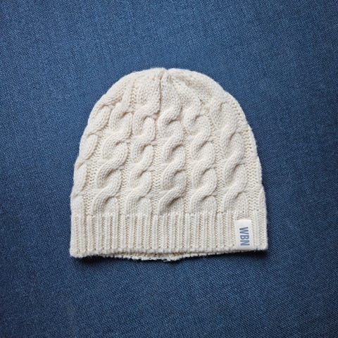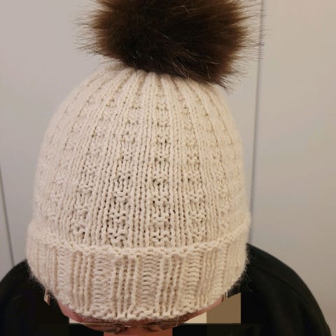 Hjemmestrikket Klompelompe lue i voksenstørrelse, med fin dekorblomst. Strikket i kløfri offwhite merinoull. #klompelompe #hjemmestrikk