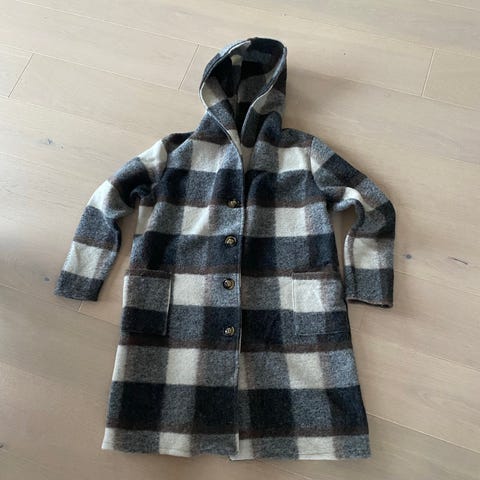 Brukt et par ganger, 60 % ull og 40 % polyester. Hette. Fra Pepper. Str m men god i størrelse.