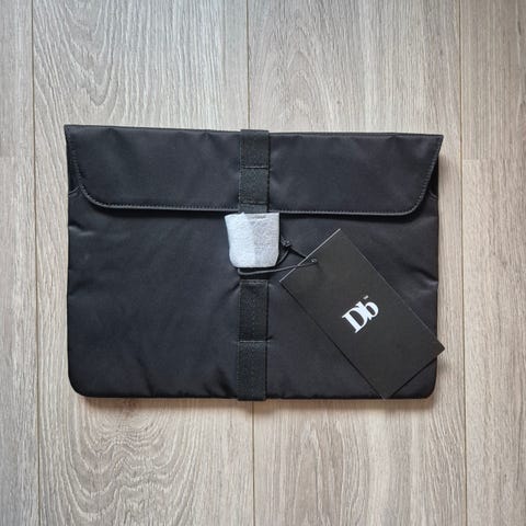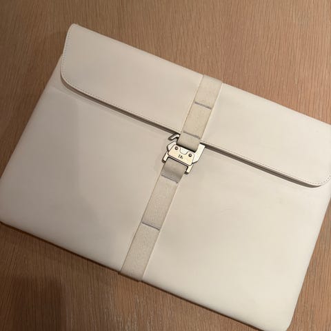 DB lær veske laget av lærmateriale. Vesken har en lukking med spenne og et enkelt, elegant design. Som ny! Essential Laptop sleeve (PC-veske) fra Douchebag. Passer til MacBook Pro 16". Ca 36 x 25 cm. Hvit. Knapt brukt.