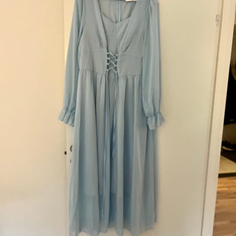 Selger en pent brukt kjole. Er noen år gammel men bare brukt ett par ganger. Som vist på bildet kan man se ett par løse tråder noen plasser, men de kan nok bare klippes bort, tror bare det er fra paljettene.