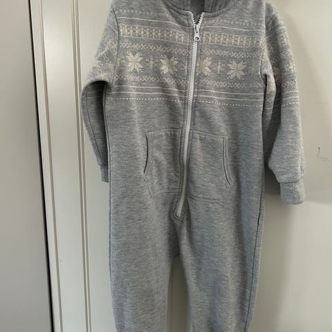 Beskrivelse: Myk og varm fleecedress/pyjamas i gråfarge med rødt/hvitt strikkemønster på brystet (nordisk stil). Med hette og lommer. 100% Polyester.