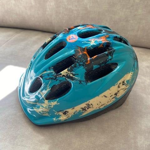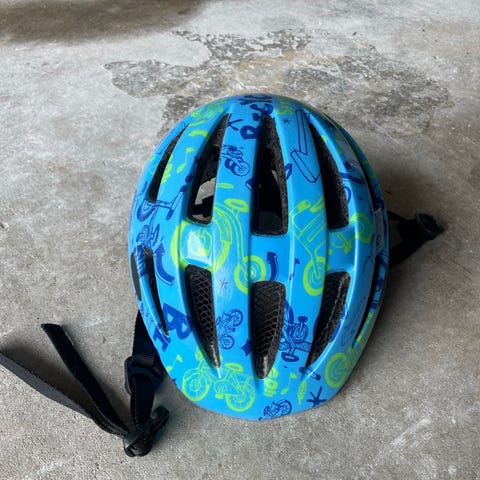 Uvex sykkelhjelm i hvit farge med blå mønster. Hjelmen har flere ventilasjonsåpninger for lufting. Passer til barn og unge. Størrelse 46-53