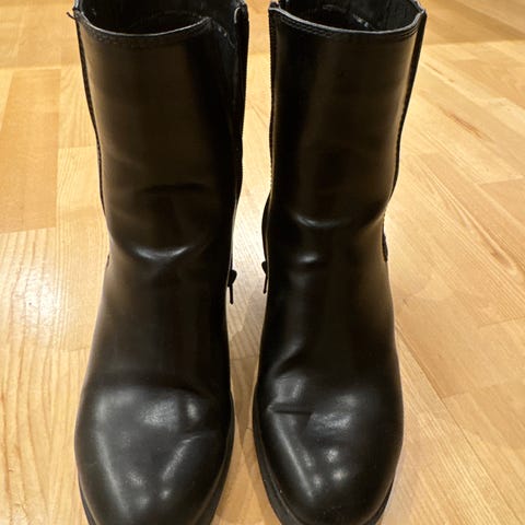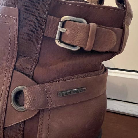 Jean Paul støvler i størrelse 41, laget av svart skinn. Lett foret. Støvlene har glidelås på siden og dekorative spenner. Yttersålen er laget av gummi. Egnet for bruk i forskjellige anledninger hvor høye støvletter er ønskelig.