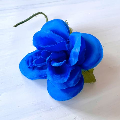 Vintage Maiblomst i gul, blå, rød, grønn / flerfarget. Blomsten er laget i plast og papir og har flott dybde og glans.