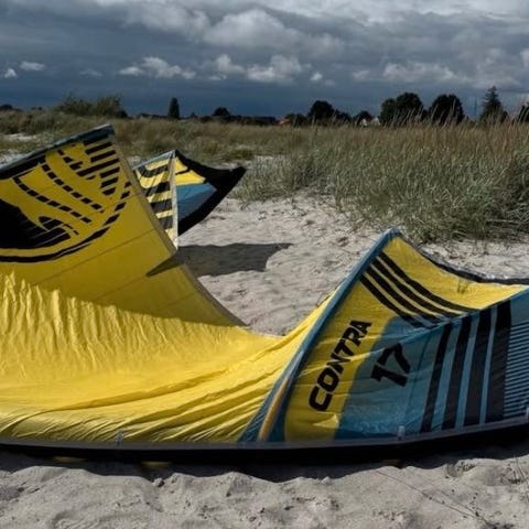 Kite (2021 model) ,7m med bar, liner, trapes (large) og ny pumpe. Hjelm og Oakley briller følger med. Lite brukt. Vanlig kurskite for nybegynnere. Trenger 4 sekundmeter vind.