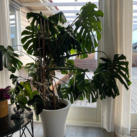 Stor og etablert Monstera deliciosa. Planten er ca. 150–160 cm høy fra gulv til toppen av øverste blad og har mange store, flotte blader med naturlige hull. Den er voksen og naturlig vokst, det er ikke flere små planter samlet i én potte.