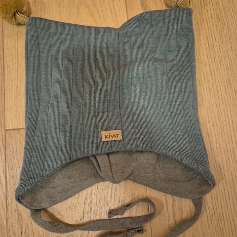 Kivat ull lue med dusker i blå farge str 0 som tilsvarer 0-1år,
