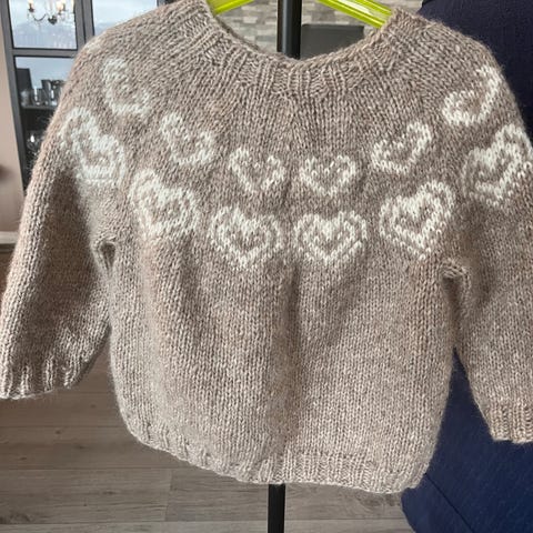 Fargerik hjemmestrikket barnegenser selges for 550kr