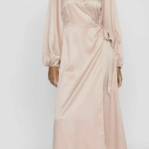 Lang kjole i sateng med omslagsdesign fra Second Female. Den har lange utsvingte armer og draperinger foran på midjen og midt bak, lukkes med glidelås i ryggen. Laget av 100% Viskose, normal i størrelsen.